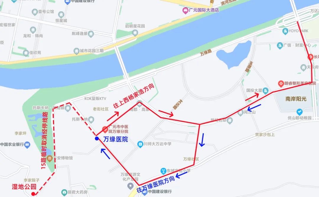 調(diào)整后:濕地公園終點(diǎn)站臨時(shí)調(diào)整至萬(wàn)緣醫(yī)院公交站點(diǎn)。